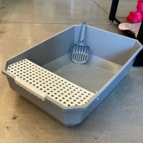 - Caixa de areia para gatos espaçosa e coberta com um lindo desenho de toranja!